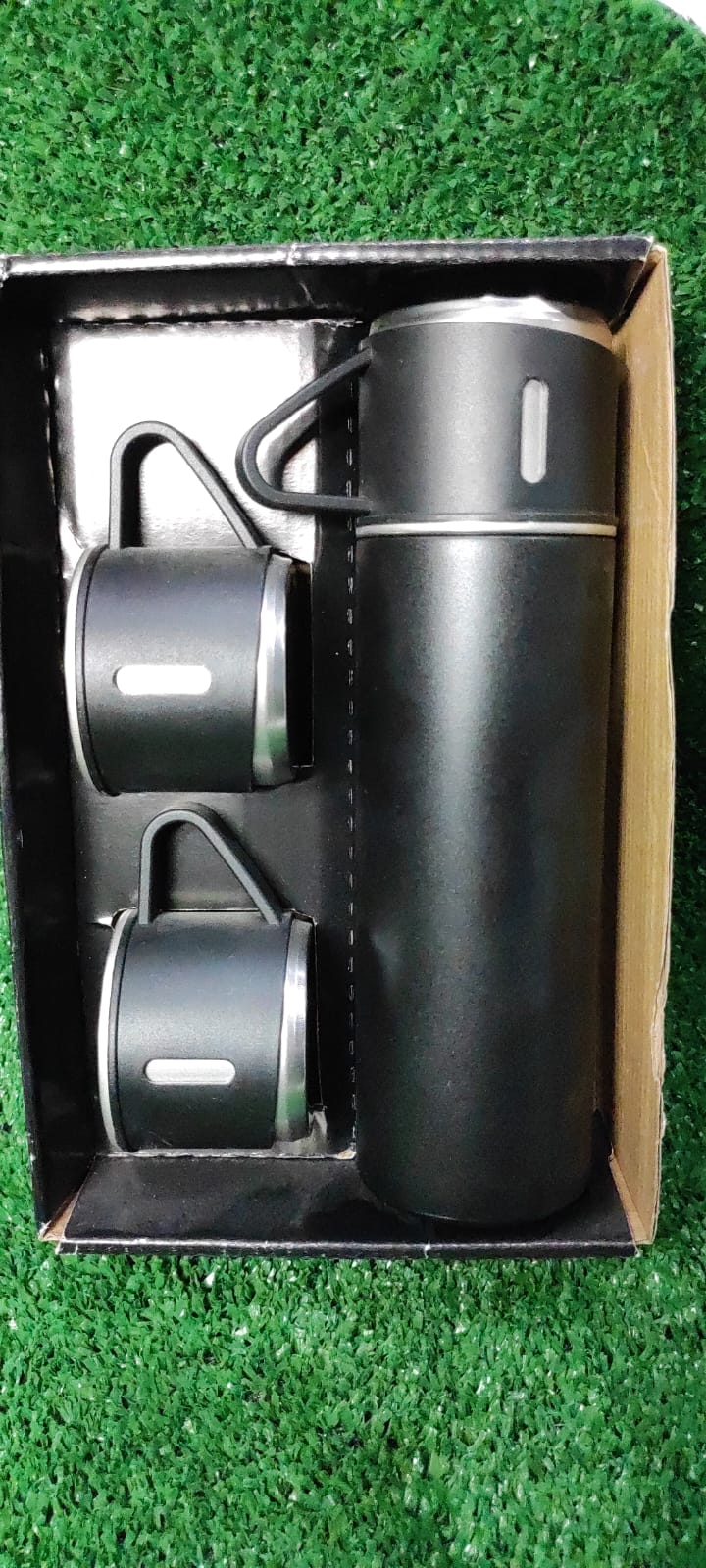 Descrição: Kit garrafa térmica 450ml com duas tampas extras que podem ser utilizadas como xícaras. Garrafa produzida em inox com base antiderrapante e tampas de inox com revestimento plástico. Acompanha sacola de papel com berço de papelão para acomodação das peças.